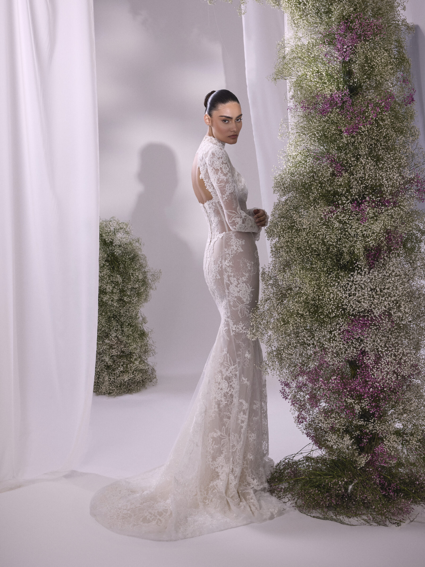 An elegant fitted gown crafted entirely from intricate lace, featuring long sheer sleeves and a soft, plunging neckline. The body-hugging design highlights the bride’s silhouette while delicate floral motifs trail gracefully along the gown. A timeless choice for a bride inspired by vintage romance with a modern spirit.