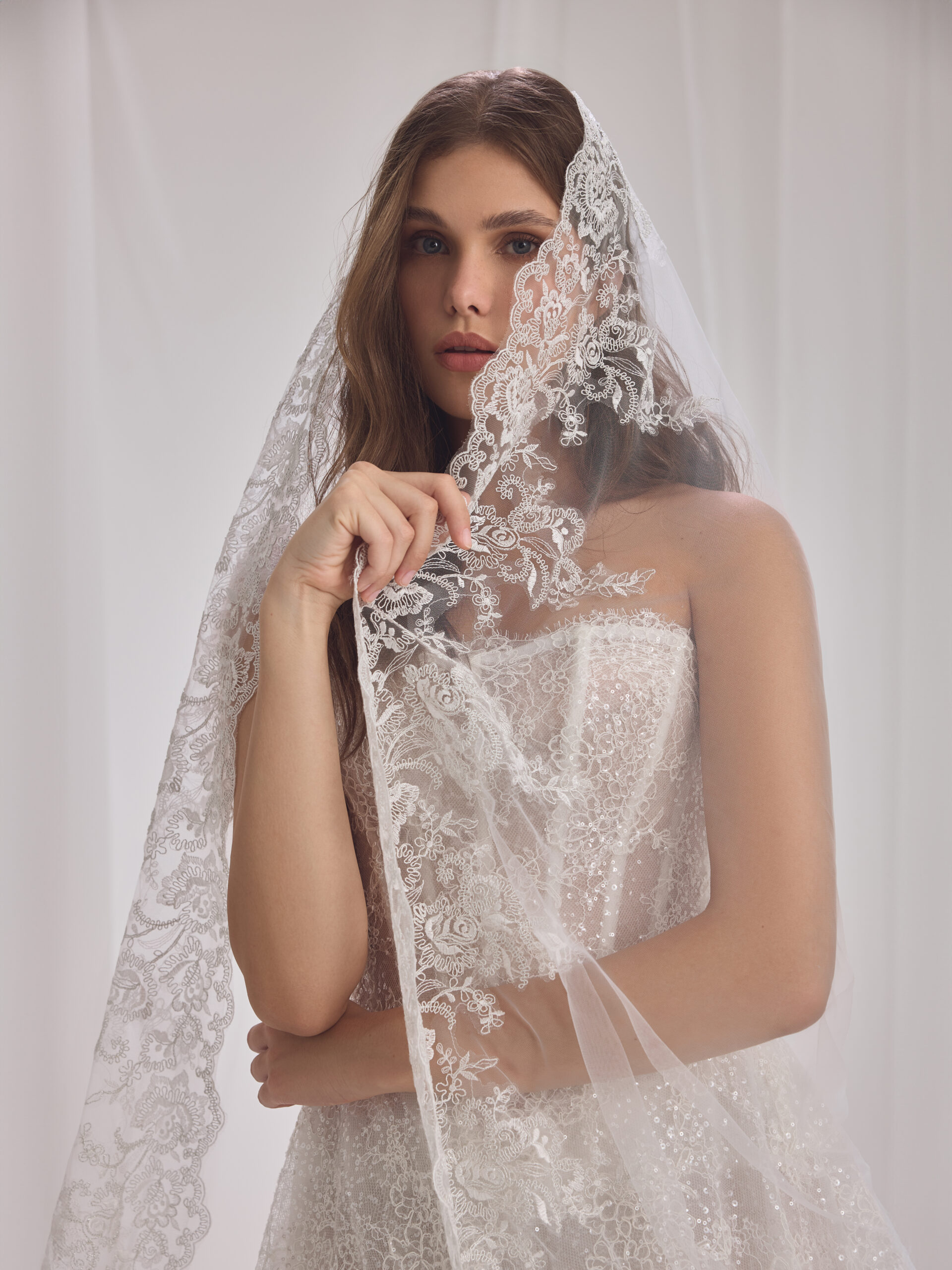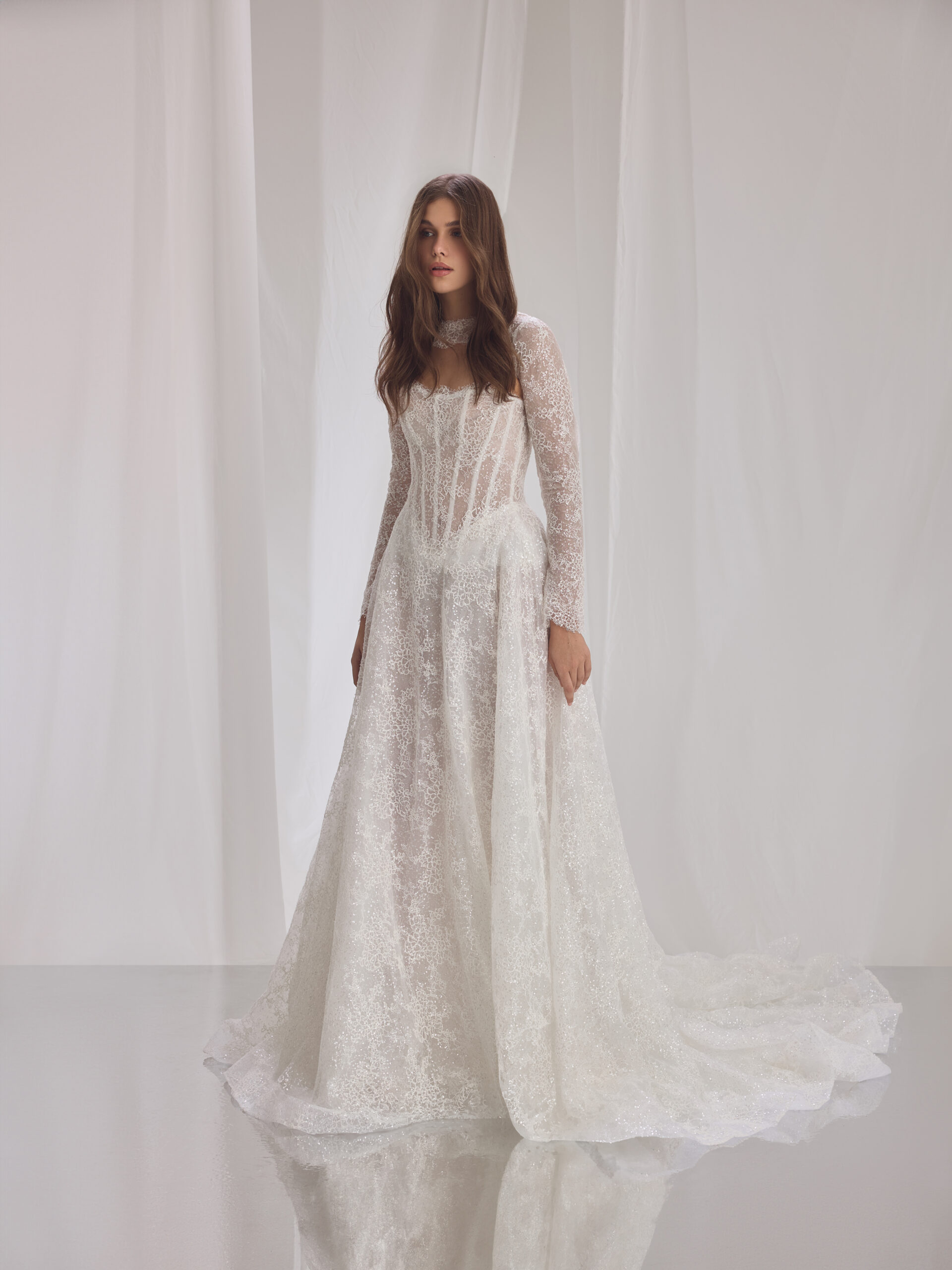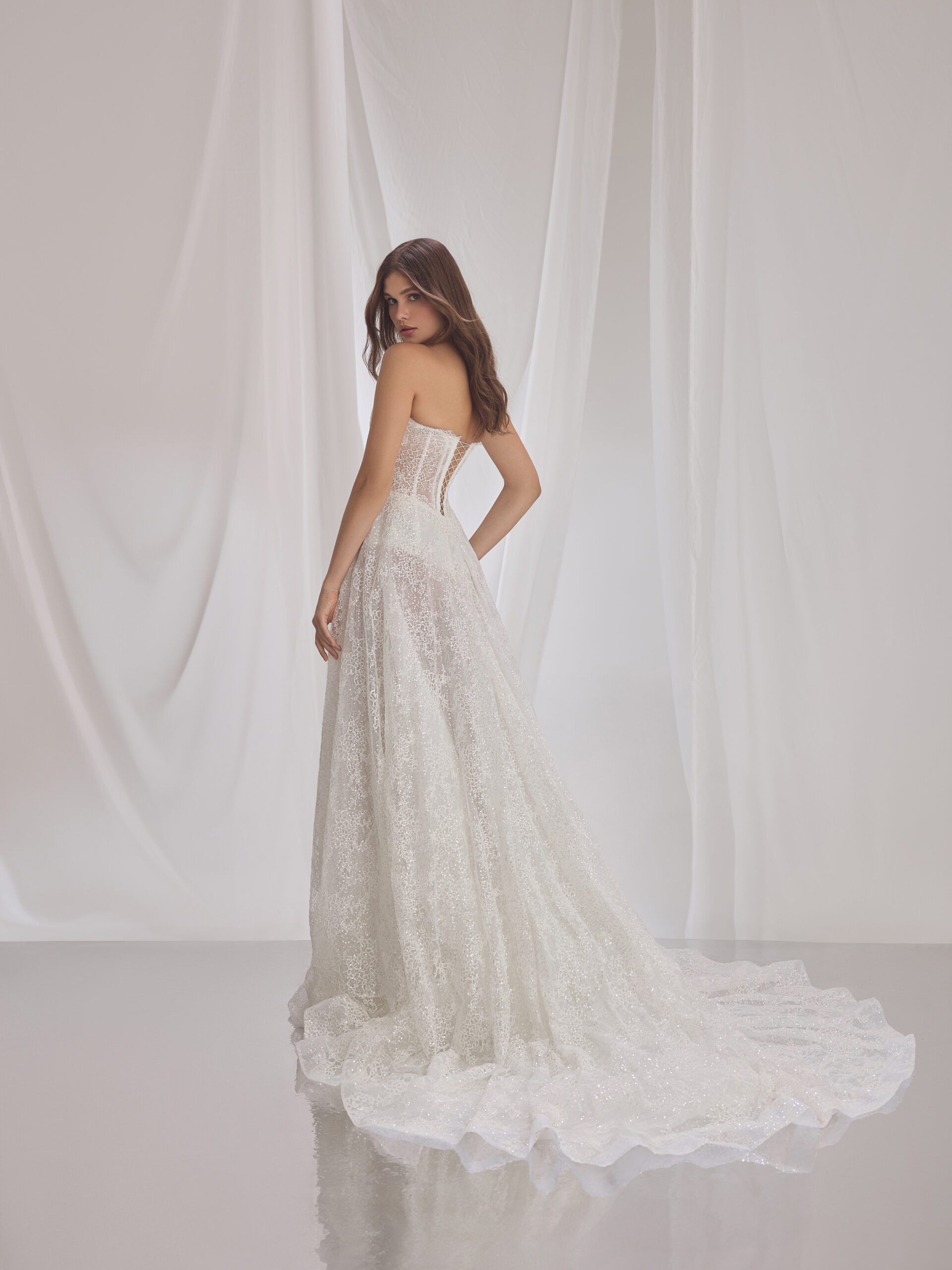 A luminous lace gown where delicate sparkle meets refined structure. Classic at its core, yet infused with modern bridal sensuality