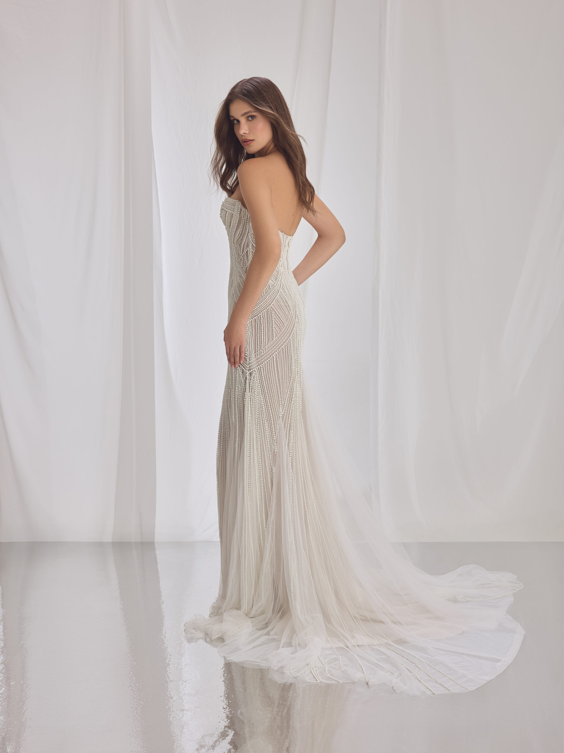Elongated lines of delicate beading create a fluid, luminous silhouette.