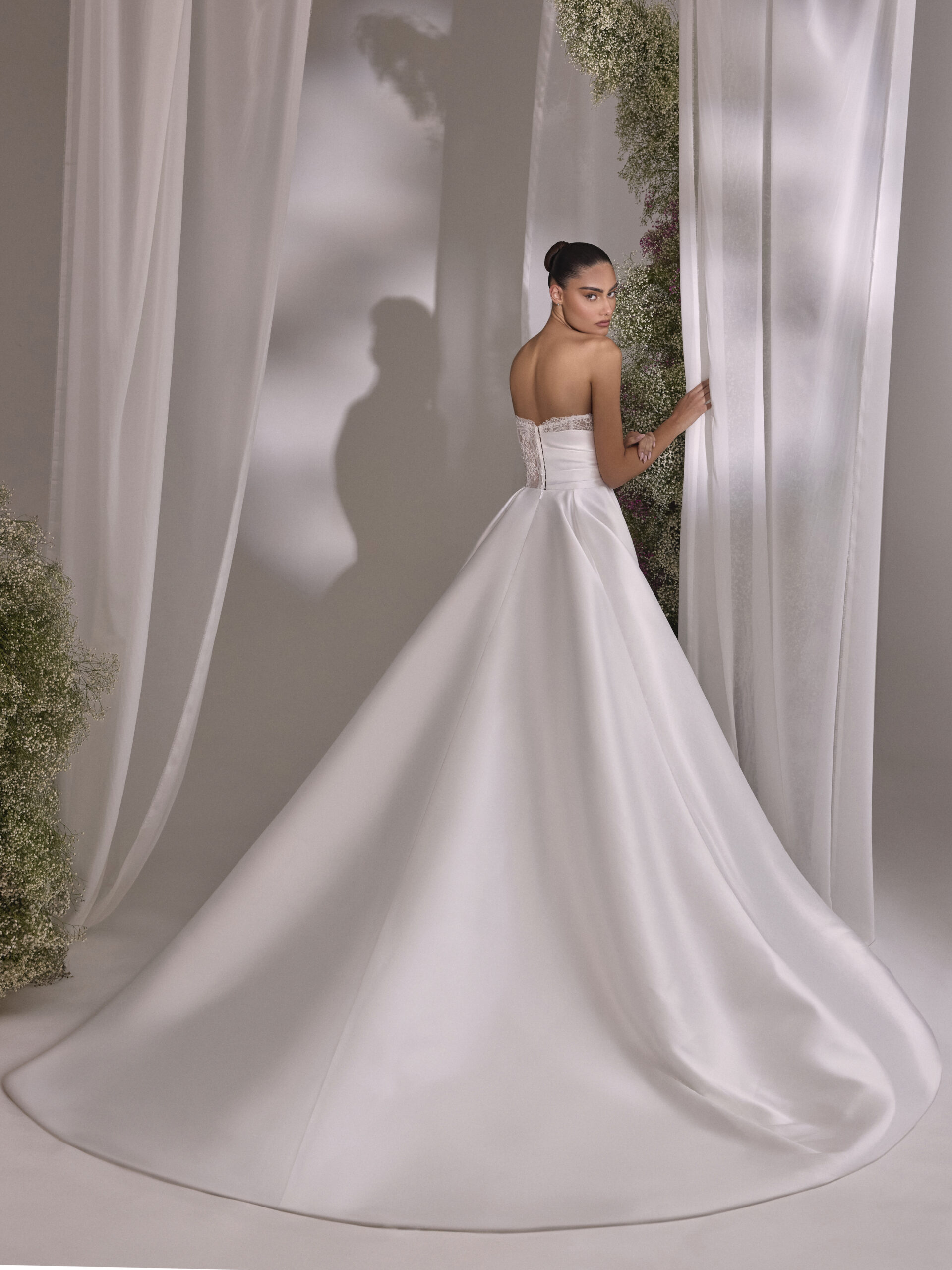 A breathtaking strapless gown featuring a sheer lace corset bodice and a luxurious satin skirt. The delicate lace brings a romantic softness to the sculpted silhouette, while the flowing satin skirt and bold thigh-high slit create a look that is both captivating and unforgettable.