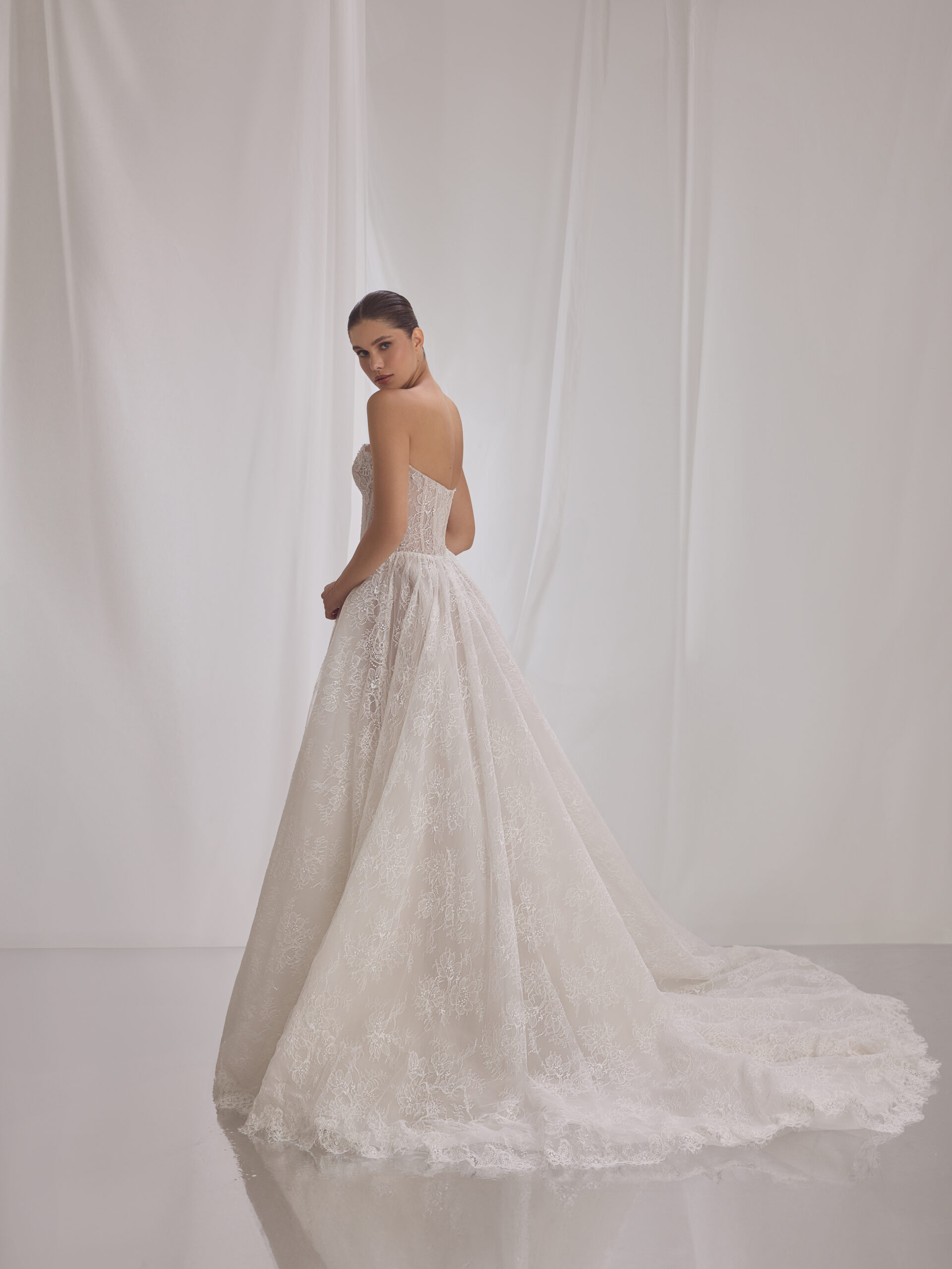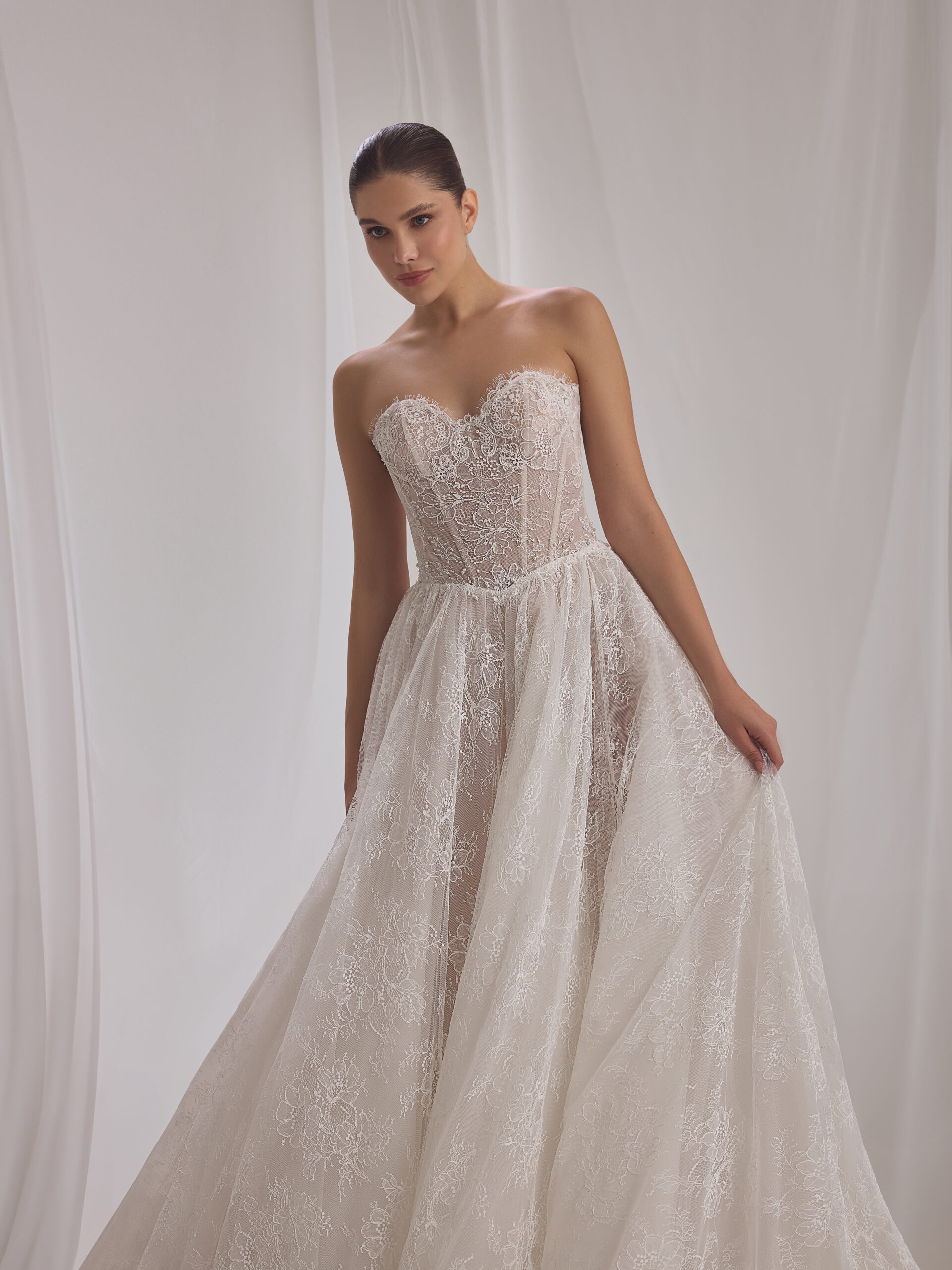 A strapless lace gown shaped by softness, volume, and restraint