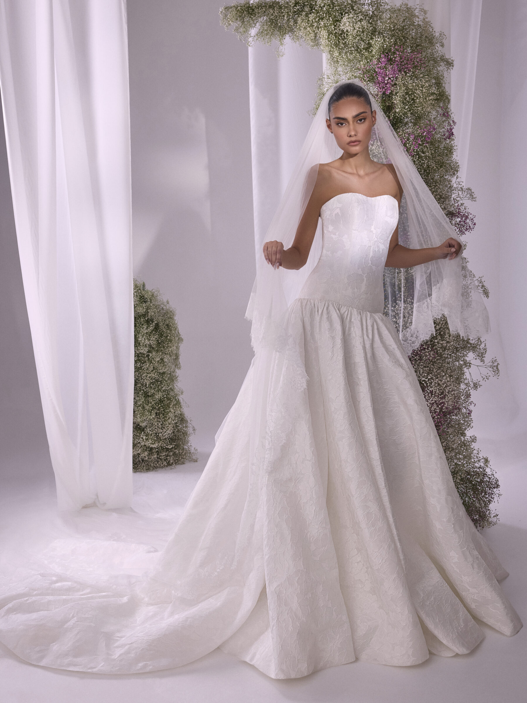 A classic strapless gown crafted from luxurious brocade satin, featuring an elegant floral texture woven into the fabric. The structured bodice sculpts the silhouette beautifully, while the softly gathered skirt cascades into a romantic, voluminous shape. A perfect harmony of timeless sophistication and modern grace.